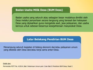 Badan Usaha Milik Desa (BUM Desa) didirikan untuk mengelola aset dan jasa pelayanan demi kesejahteraan masyarakat desa, berdasarkan Permendes PDTT No. 4/2014. Tujuan BUM Desa termasuk meningkatkan perekonomian desa, membuka lapangan kerja, dan memperbaiki pelayanan umum. Pendirian BUM Desa melibatkan musyawarah desa serta mempertimbangkan potensi ekonomi dan sumber daya yang ada di desa.