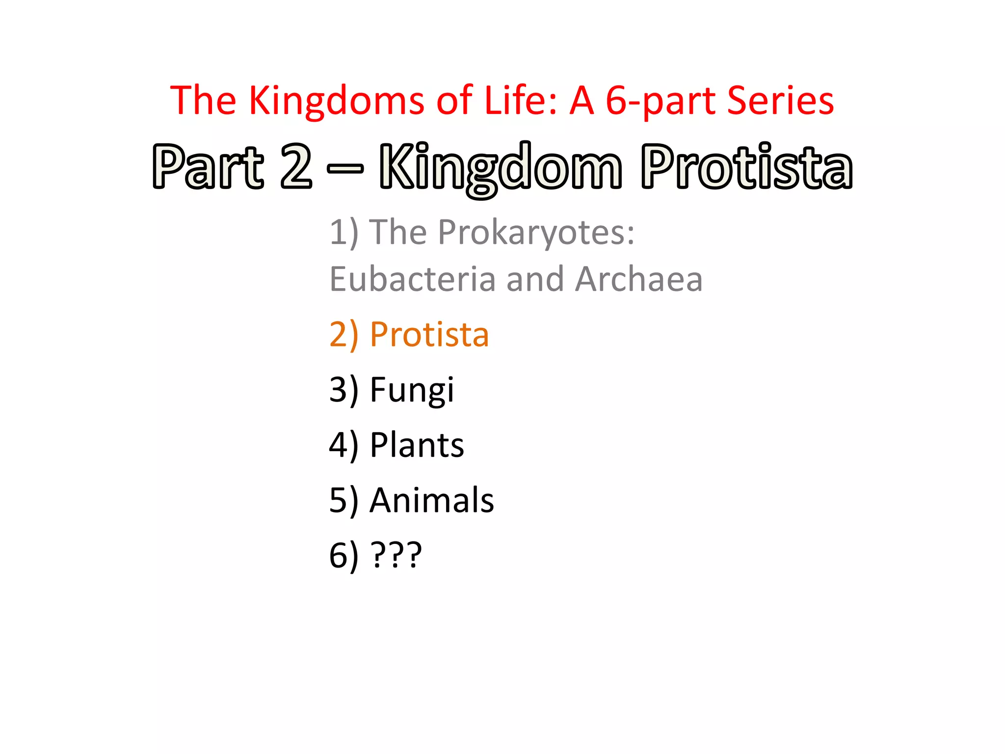 1) The document outlines the kingdoms of life and differences between prokaryotes and eukaryotes. It describes how mitochondria and chloroplasts are thought to have originated from prokaryotes that engaged in endosymbiosis with early eukaryotes.