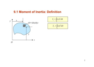 This document discusses moments of inertia, which are a measure of an object's resistance to rotational acceleration about an axis. It defines the moment of inertia of an area and introduces key concepts like the parallel axis theorem, radius of gyration, and calculating moments of inertia through integration or for composite areas. Examples are provided to demonstrate calculating moments of inertia for various shapes, including rectangles, triangles, L-shapes, and composite profiles, about different axes. The document also covers determining moments of inertia at the centroidal axes versus other axes using the parallel axis theorem.