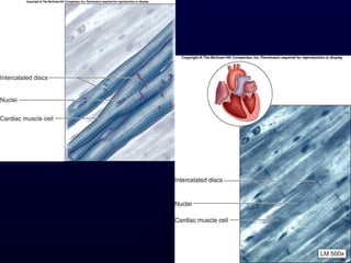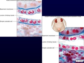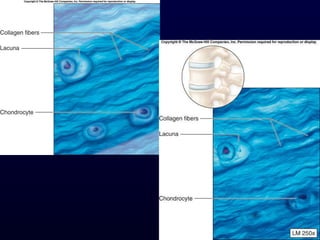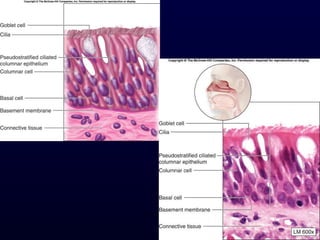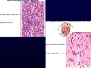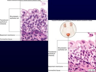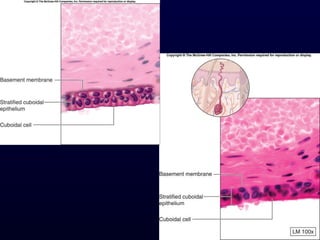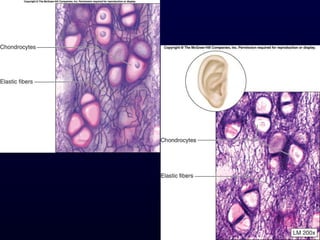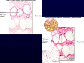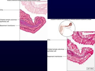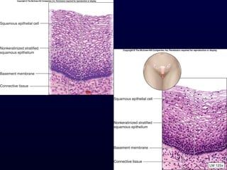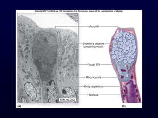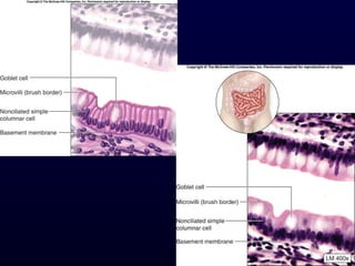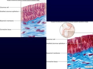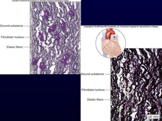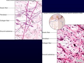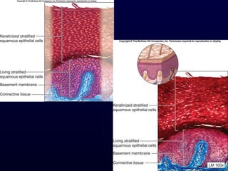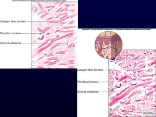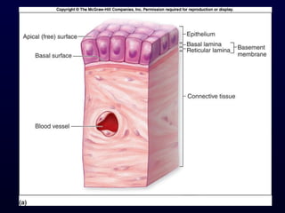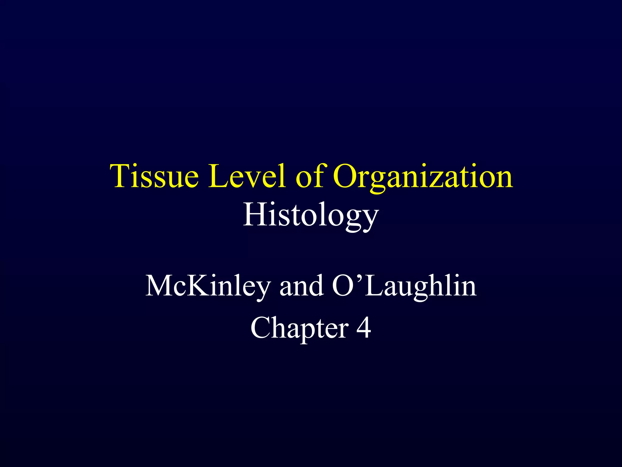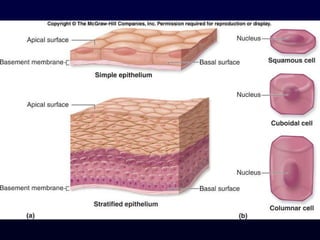 This document summarizes the four primary tissue types - epithelial, connective, muscle and nervous tissue. It focuses on epithelial and connective tissues, describing their characteristics, functions and major classifications/types. For epithelial tissue, it discusses membranous and glandular epithelia, as well as simple, stratified, pseudostratified and transitional epithelial types based on layering and cell shape. For connective tissue, it describes the components and functions, then subclasses into connective tissue proper, supporting and fluid connective tissues.