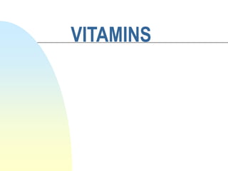 This document provides information about vitamins and supplements. It discusses what vitamins are, their functions, dietary sources, recommended intake levels, deficiency symptoms, and risks of excess intake. The document also focuses on specific vitamins like B vitamins and Vitamin A, outlining their roles, food sources, recommendations, deficiency symptoms, and those at risk of deficiency. It emphasizes that a healthy diet is generally the best way to meet nutritional needs, and supplements should not replace whole foods.