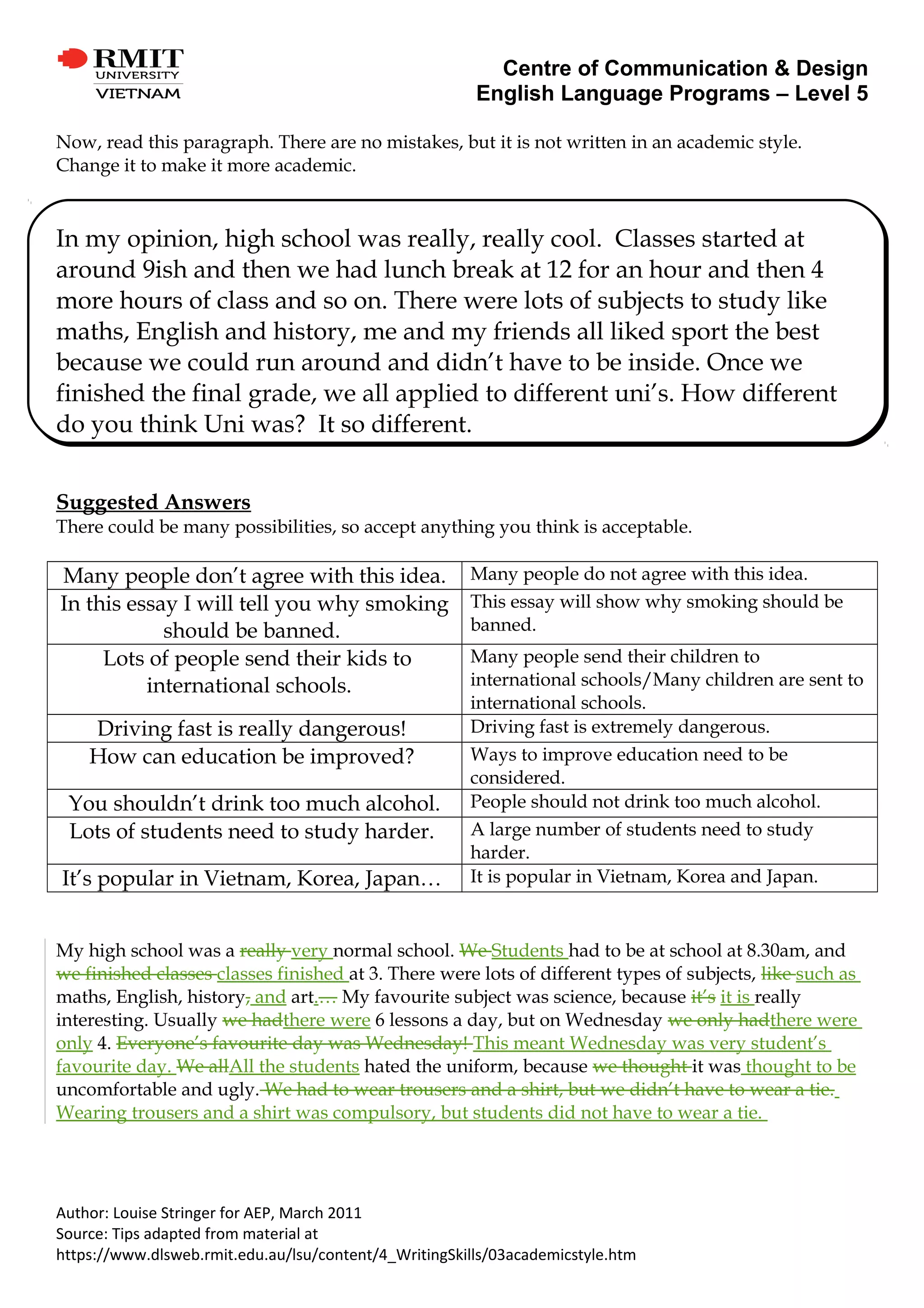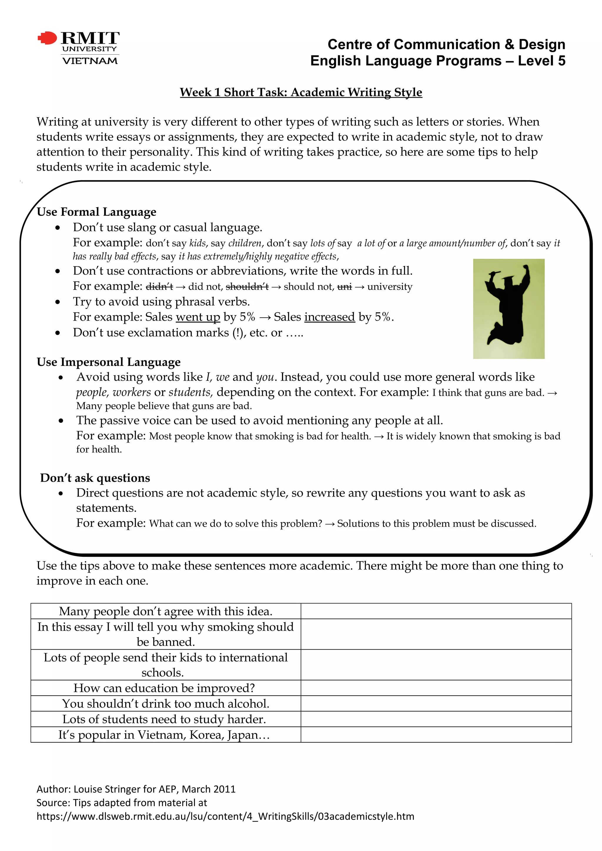 The document provides tips for writing in an academic style at the university level. It advises using formal, impersonal language without slang, contractions or abbreviations. Direct questions should be rephrased as statements. Examples are given of rewriting sentences to be more academic by changing word choice, removing first-person pronouns, and shifting to the passive voice. The document also contains an example paragraph that is revised to demonstrate applying the suggested academic writing style.