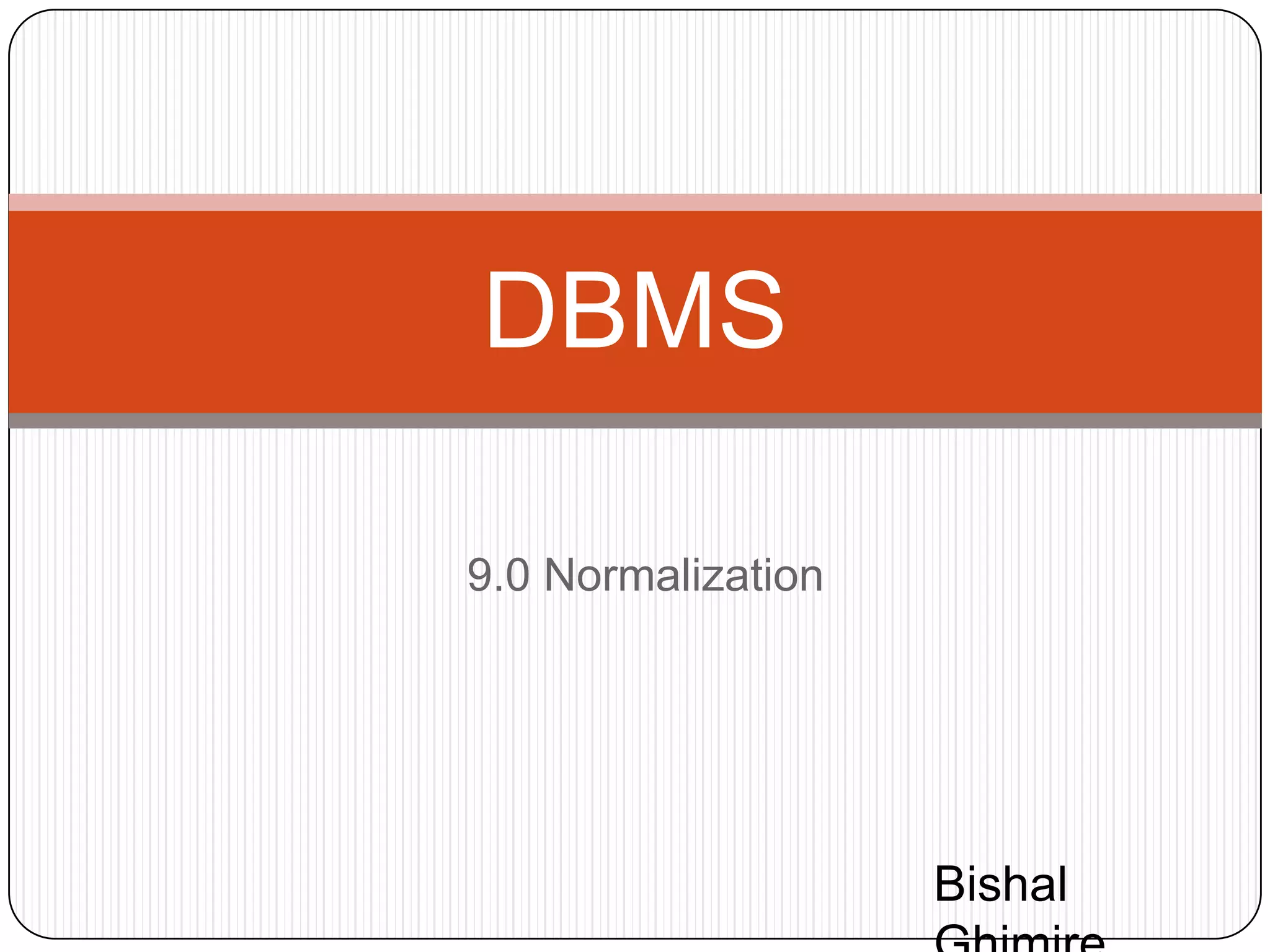 The document discusses database normalization. It defines functional dependency and explains how anomalies like redundancy, insertion anomalies, deletion anomalies, and update anomalies can occur in a database without normalization. It also describes the different normal forms including 1NF, 2NF, 3NF and BCNF. Decomposition is introduced as a process to normalize relations by eliminating anomalies. The goal of normalization is to ensure data is stored efficiently and consistently without redundancy.