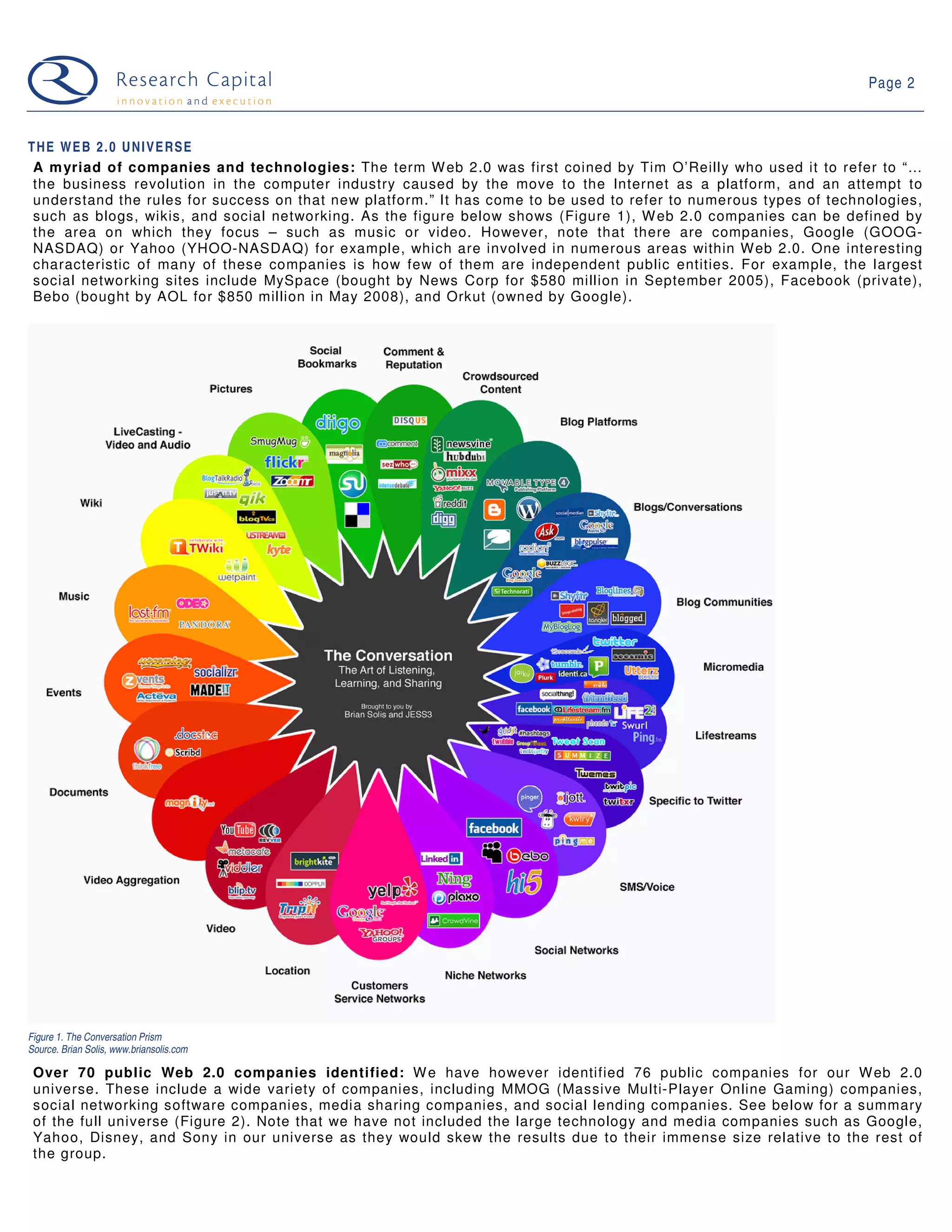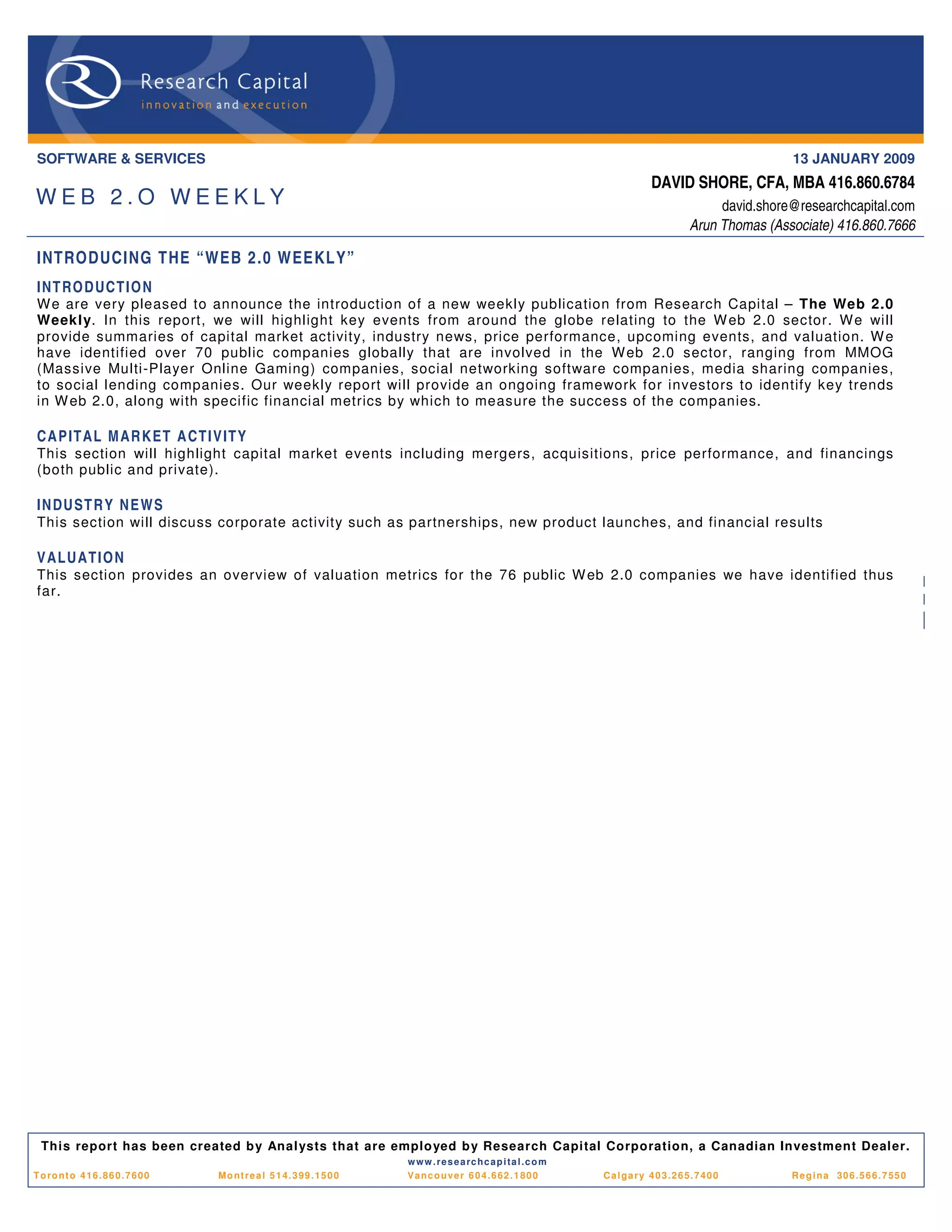 This document introduces a new weekly publication from Research Capital called "The Web 2.0 Weekly". The report will highlight key events and news in the global Web 2.0 sector, including capital market activity, industry news, upcoming events, and valuation metrics for the 76 public Web 2.0 companies identified. It provides an overview of the diverse universe of Web 2.0 companies and technologies, from social networking to online gaming.