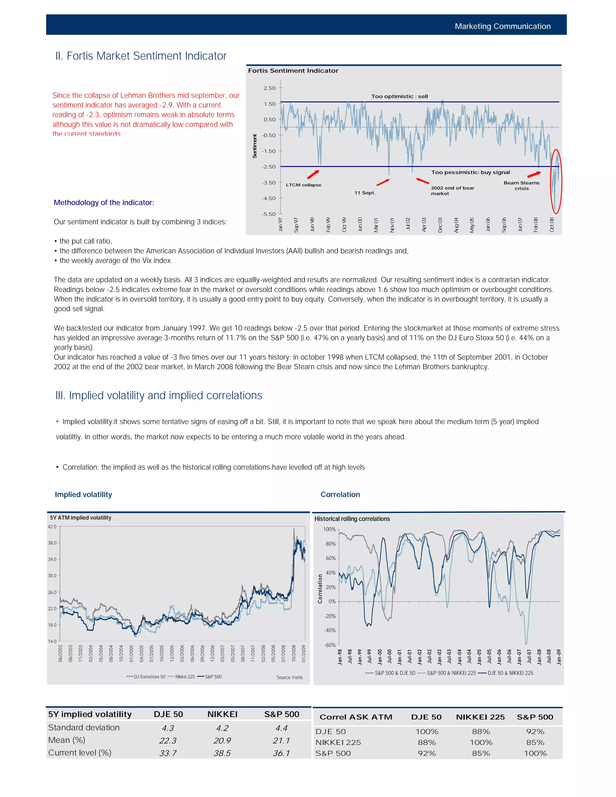 1. The document provides an overview of structured equity markets and discusses recent economic and market developments. It notes that stock markets declined for a fourth straight week due to bad economic data and cautious earnings guidance. 2. A sentiment indicator created by the author remains weak, though not at dramatically low levels compared to recent standards. The indicator suggests markets remain fearful but not overly so. 3. Implied volatility is showing tentative signs of easing but remains elevated, suggesting continued volatility ahead. Correlations between markets have also remained high. 4. Company earnings continue declining significantly compared to prior years. Valuations have become less expensive but depend on how long earnings drops persist.