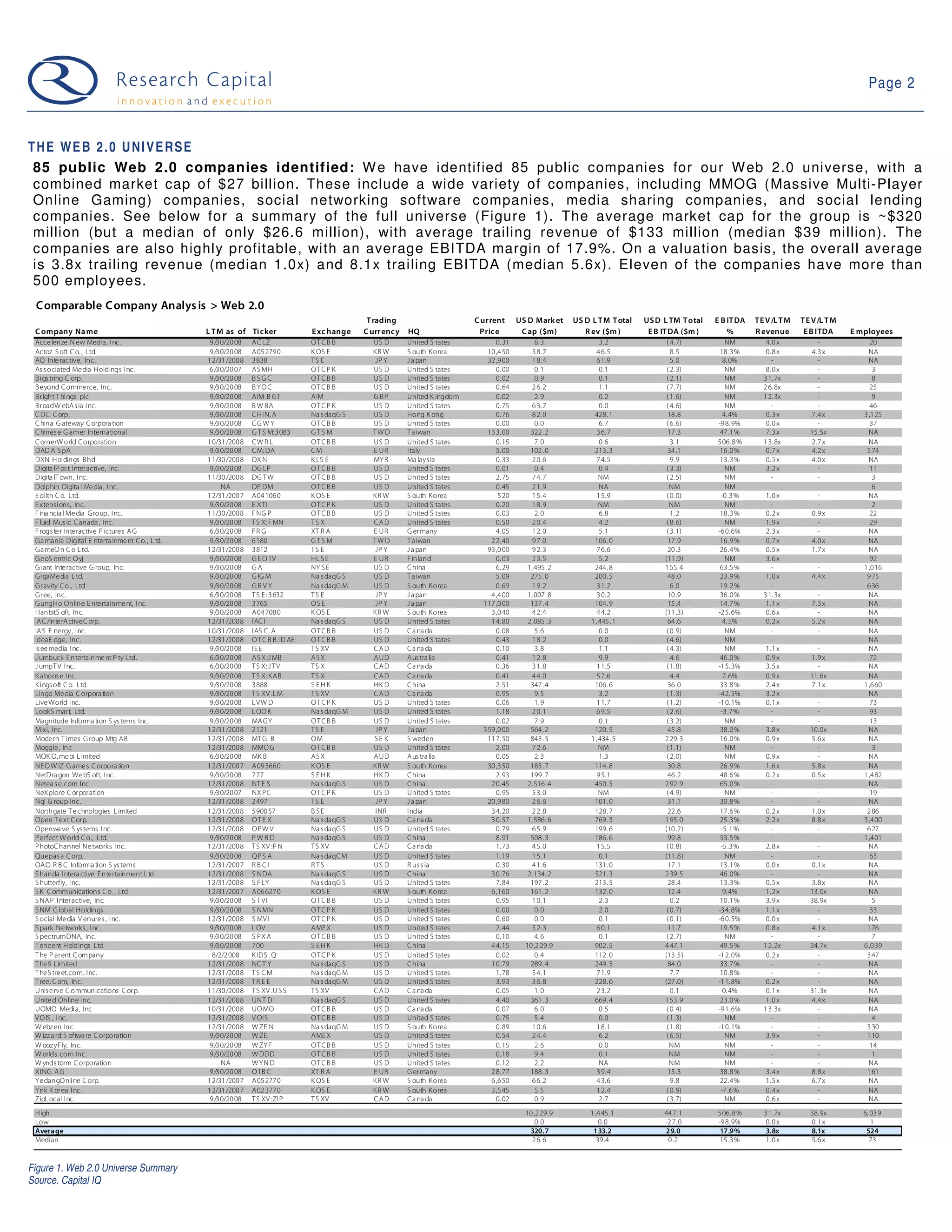 The report analyzes Q4 2008 results from major MMORPG companies, indicating that the market remains resilient despite economic challenges, with notable revenue growth. The document highlights 85 public Web 2.0 companies with a combined market cap of $27 billion, showcasing their profitability and varying revenue metrics. Additionally, it provides a detailed valuation analysis of these companies, reflecting their average market cap and EBITDA margins.