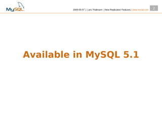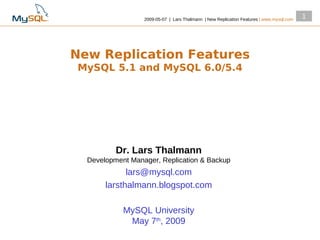 This document summarizes new replication features in MySQL versions 5.1, 6.0, and 5.4. Key features include row-based replication in 5.1, ignoring servers in circular replication in 6.0/5.4, replication heartbeat and slave position synchronization in 6.0/5.4, automatic relay log recovery in 6.0/5.4, and semi-synchronous replication as a pluggable architecture in 6.0/5.4. Ongoing projects previewed include multi-threaded replication slaves and time-delayed replication.