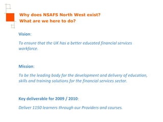 The document outlines the North West Region Strategy and Plan for 2009/10 of the National Skills Academy for Financial Services (NSAFS). The key goals are to: