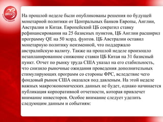 На прошлой неделе были объявлены решения центральных банков Европы, Англии, Австралии и Китая, включая снижение ставки ЕЦБ и расширение программы QE Банком Англии. Ожидания стабильности на рынке труда США снизили вероятность новых стимулов от ФРС, что негативно сказалось на фондовом рынке. На этой неделе важные экономические данные отсутствуют, акцент будет на корпоративной отчетности и прогнозах по экономическому росту в различных регионах.