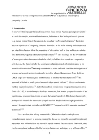 The document summarizes research on an organic-nanoparticle transistor (NOMFET) that exhibits behaviors analogous to a biological spiking synapse. The NOMFET combines a transistor and memory effects from gold nanoparticles embedded in a pentacene layer. It can be programmed to facilitate or depress synaptic transmission like biological synapses. Short term plasticity is demonstrated by varying the input pulse frequency, with depression at high frequencies and facilitation at low frequencies. A model is developed to describe the NOMFET's synaptic behavior in terms of neurotransmitter resources and recovery time. This research suggests NOMFETs may be useful for neuromorphic computing circuits that mimic biological neural processing.