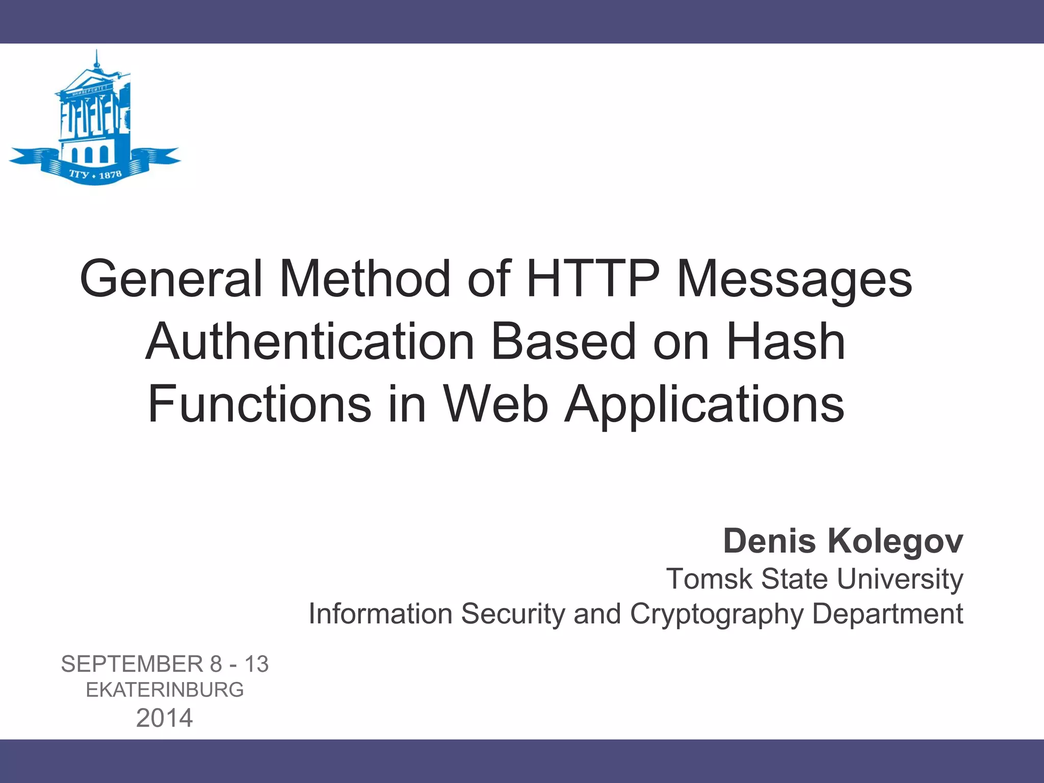 The document discusses a general method for HTTP message authentication using hash functions, aimed at enhancing web application security against common threats such as CSRF attacks and insecure direct object reference. It outlines various protection methods, the limitations of existing strategies, and presents a proposed authentication protocol that incorporates client-side data validation and various policies for secure user input. Additionally, it highlights the implementation of the proposed method in a Django framework as a proof of concept.