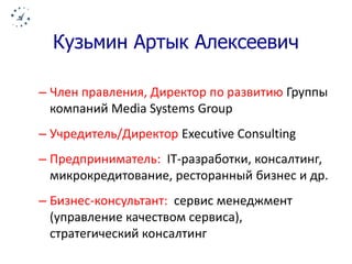 Документ представляет мастер-класс по управлению качеством сервиса от Артыка Кузьмина, акцентируя внимание на переходе от экономики услуг к экономике впечатлений. Основное внимание уделяется созданию уникального клиентского опыта и важности превосходного сервиса для повышения клиентской лояльности и повторных продаж. Кузьмин делится стратегиями и принципами, необходимыми для формирования первоклассного сервиса, который восхищает клиентов.