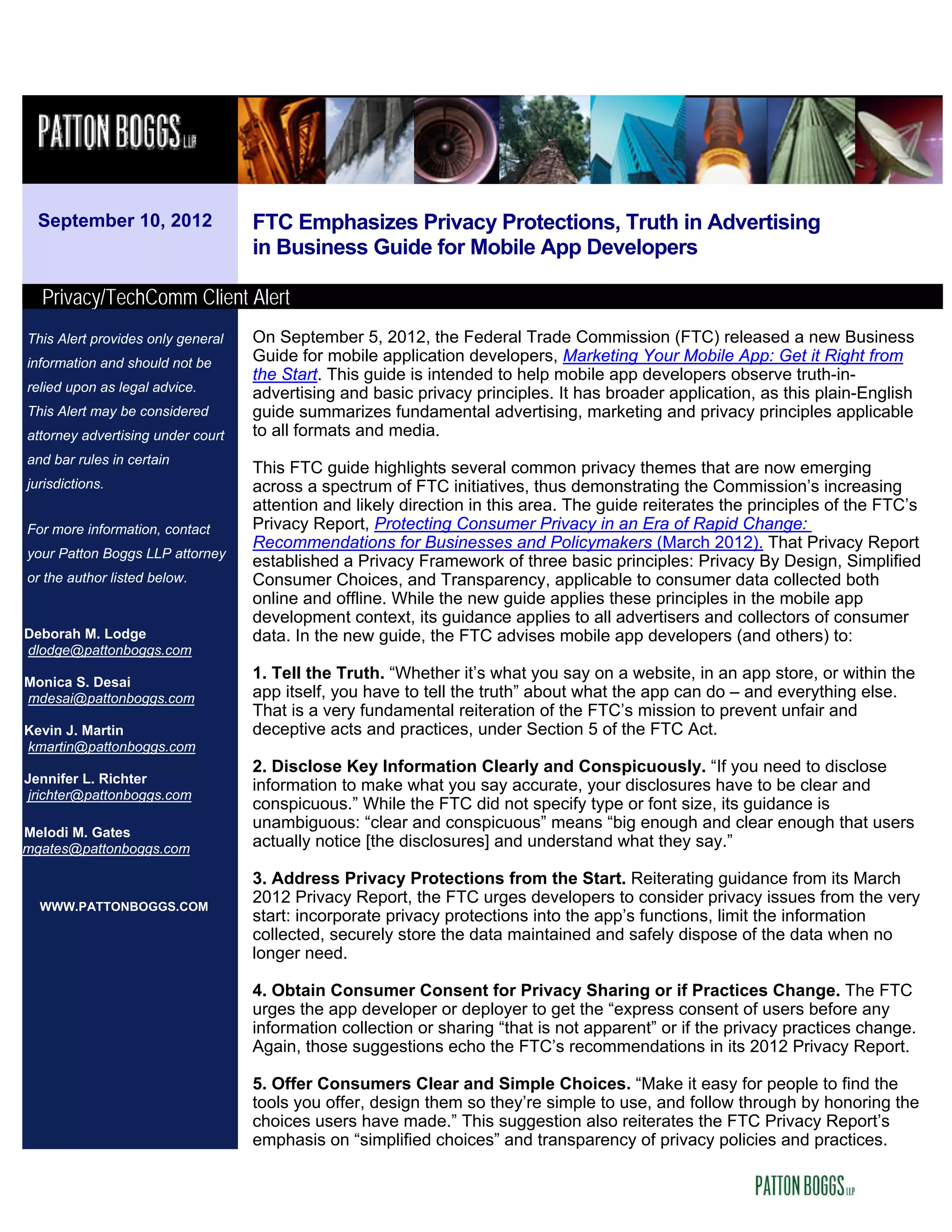 1. The FTC released a new guide for mobile app developers emphasizing truth in advertising and privacy protections.
