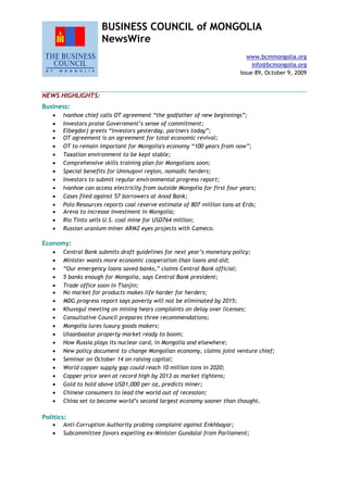 The document summarizes the signing of an agreement between the Mongolian government and mining companies Ivanhoe Mines and Rio Tinto regarding development of the Oyu Tolgoi copper-gold mining project in Mongolia. Key details include: