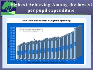 The document summarizes the Half Hollow Hills Central School District's 2009-2010 preliminary budget proposal. It outlines proposed budget increases of 3.14% for a total budget of $202,345,358. It also discusses uncertainties around potential state aid amounts and new unfunded mandates that could impact the budget. Budget reductions and cost saving initiatives proposed total around $3 million.