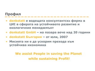 Профил denkstatt е водещата консултантск а фирм а в ЦИЕ в сферата на устойчивото развитие и екологичния мениджмънт denkstatt GmbH – на пазара вече над 20 години denkstatt България – от юли , 2007 Мисията ни е да ускорим прехода към устойчива икономика We assist People in saving the Planet while sustaining Profit !