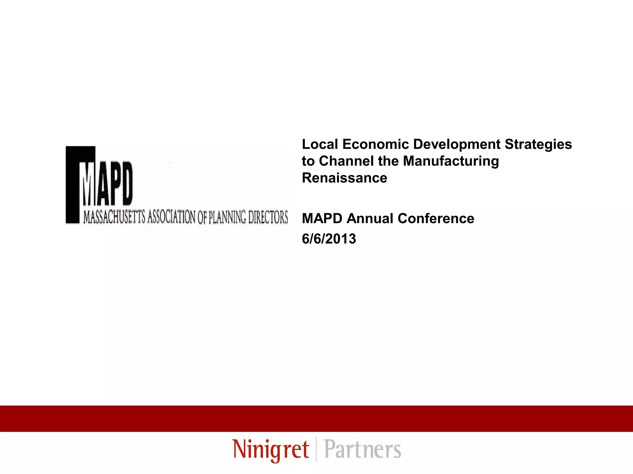 This document discusses strategies for local economic development to support the resurgence of manufacturing. It notes that while manufacturing jobs are increasing again, the future of manufacturing will likely be different than the past with trends like additive manufacturing, nano-manufacturing, and small-batch production. It also discusses challenges like outdated industrial real estate, integrating maker spaces and incubators into communities, and ensuring zoning allows for diverse new models. The document advocates for performance-based industrial zoning, protecting manufacturing sites, and taking a regional approach to workforce development and infrastructure to support modern manufacturing.
