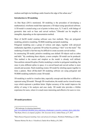 The document discusses the validity of the argument that off-the-shelf 3D GIS software cannot model Hong Kong's complex 3D cityscape. It outlines Hong Kong's dense, irregular urban form with tall, uniquely shaped buildings. It also describes 3D modeling and visualization processes, including data acquisition methods like LIDAR, and capabilities of various 3D GIS software packages. While software allows complex 3D modeling, limitations include inability to access interiors and fully represent Hong Kong's unique urban landscape.