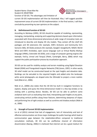 3D GIS has several strengths for public engagement in development proposals. It allows non-experts to better understand proposals through interactive 3D visualization of projects. Web-based 3D GIS makes information easily accessible to the public online instead of just at meetings. The realism of 3D models through techniques like photorealistic texturing helps users visualize how projects will look from different angles and heights. 3D GIS can also collect public feedback through integrating communication platforms like emails and forums. However, 3D GIS also has limitations such as high hardware and software requirements.
