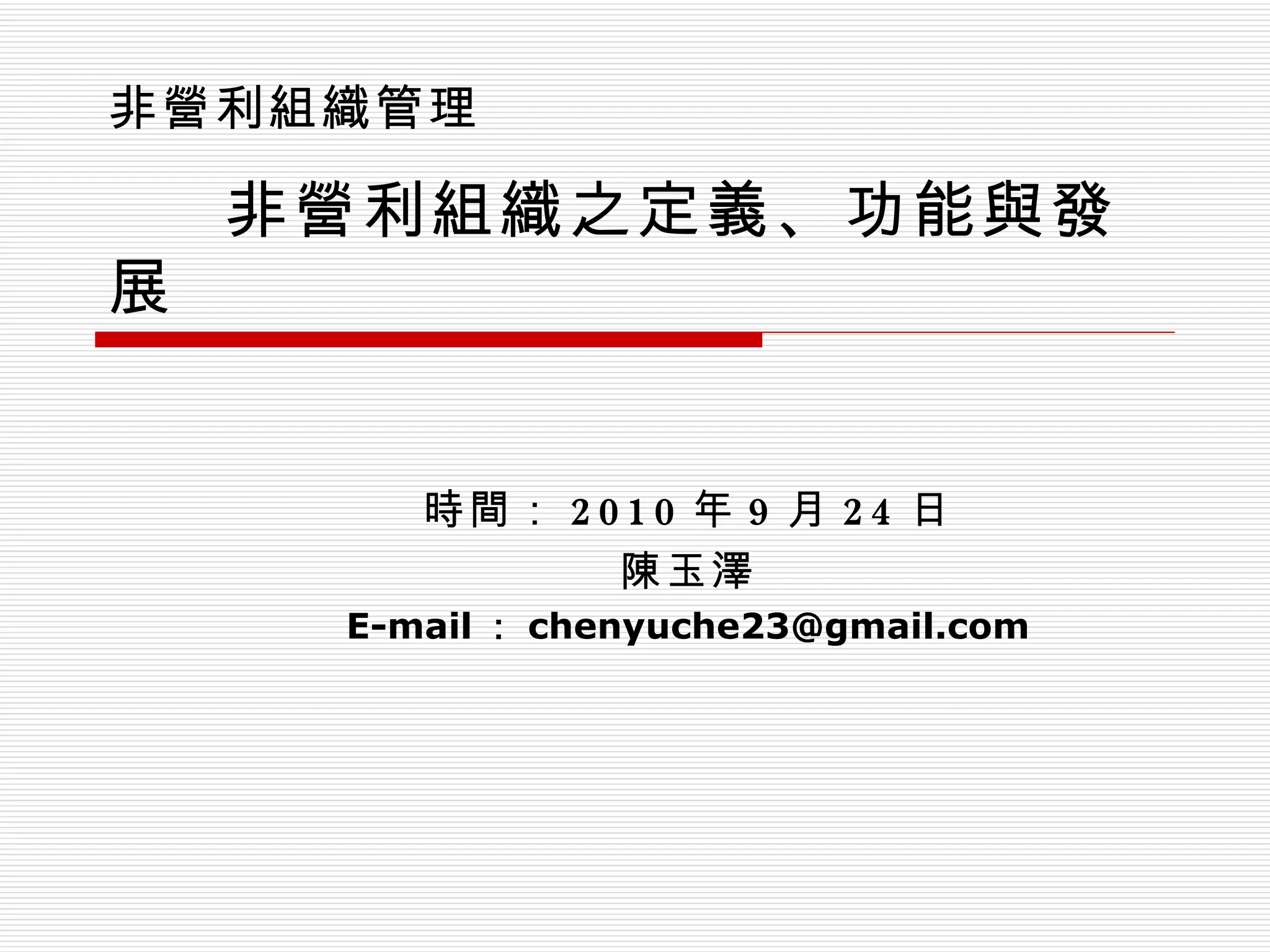 非營利組織的發展階段:開創期 工作任務:最重要工作,當屬「規劃」與「創造」 a.界定組織使命宗旨,並籌措開辦經費 b. 聘用會務主持人 c. 完成法定立案程序 d. 建立合法性、公信力,並和相關組織建立關係 f. 與其他類似組織溝通、協商,減少不必要的競爭 g. 人事佈局與設計,員工訓練與能力開發 h. 創造組織文化、哲理與核心價值 i. 規劃設計服務輸送方案、服務流程 … 等 j. 宣傳組織服務 k. 開始建立規定、行政程序,明確話職掌、角色等