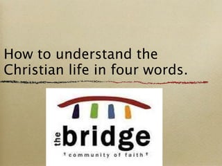 The document summarizes the Christian life in four words: come, see, go, tell. It explains that believers are invited to have personal faith in Christ and then go out into the world to testify about what has happened to them. Various Bible passages encourage Christians to come to faith, see the truth for themselves, go out and spread the gospel message, and tell others about Jesus.