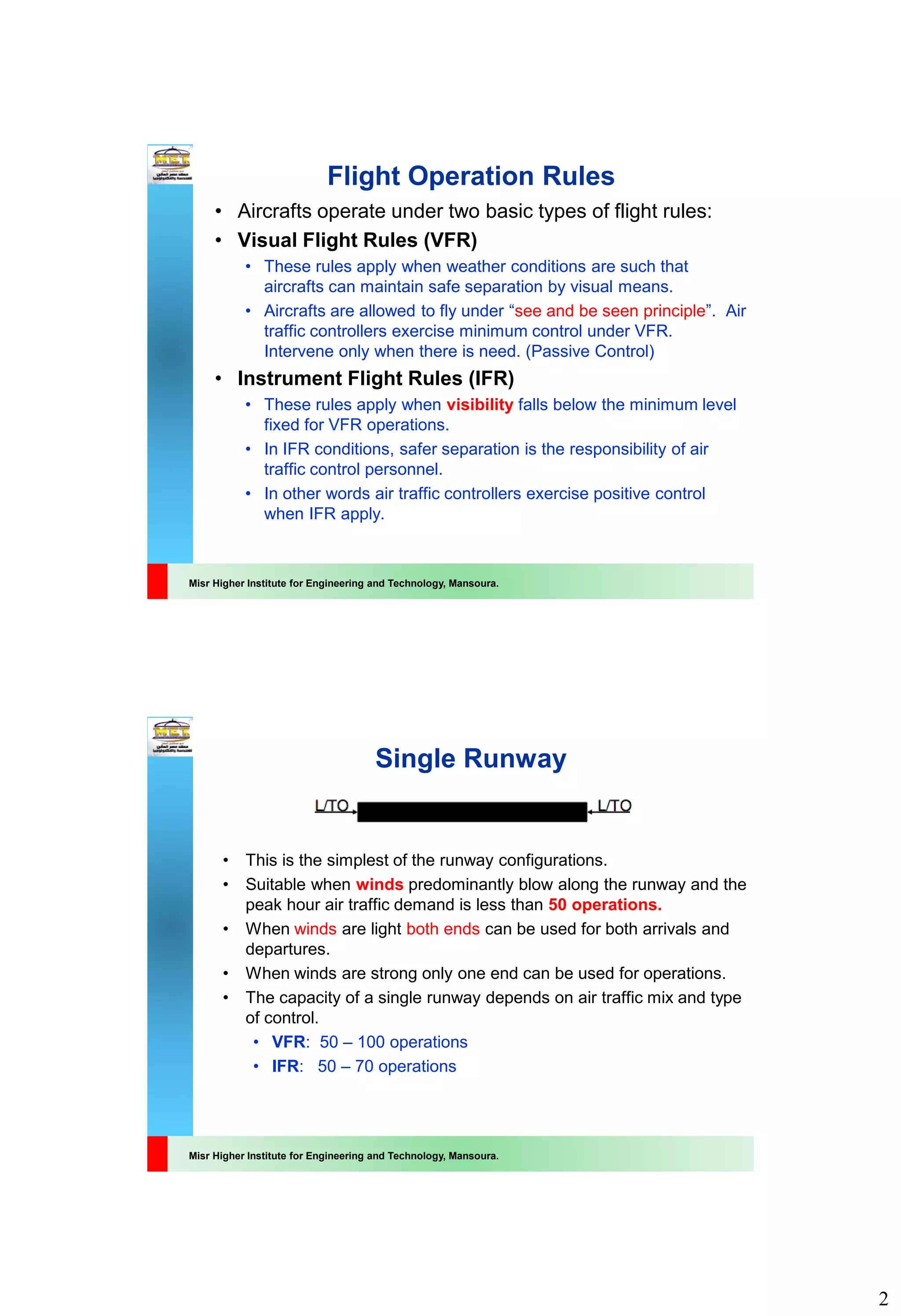 The document discusses various runway configurations including single, parallel, staggered parallel, intersecting, and open-V runways. It also describes different types of taxiways like entrance, exit, parallel, bypass, and connecting taxiways that make up the ground movement network at an airport. Flight rules depend on weather conditions, with visual flight rules applied during good visibility and instrument flight rules in low visibility conditions.