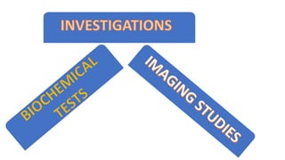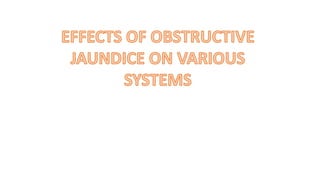 The document discusses the pathophysiology and management of obstructive jaundice, detailing the causes, physiological effects, and various types of biliary obstruction. It outlines the symptoms, diagnostics, and treatment options, including the importance of biochemical tests and imaging techniques like ultrasound and MRCP. Additionally, it emphasizes the critical need for timely intervention to manage complications and prevent recurrence.