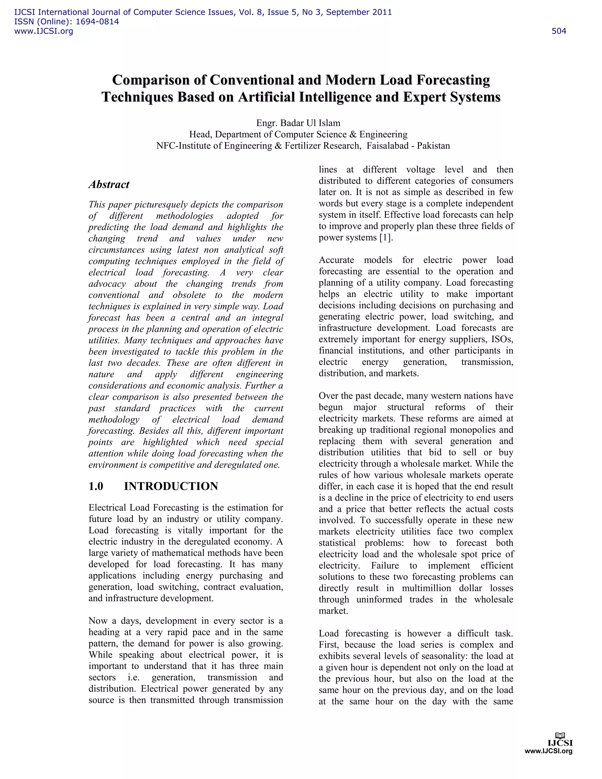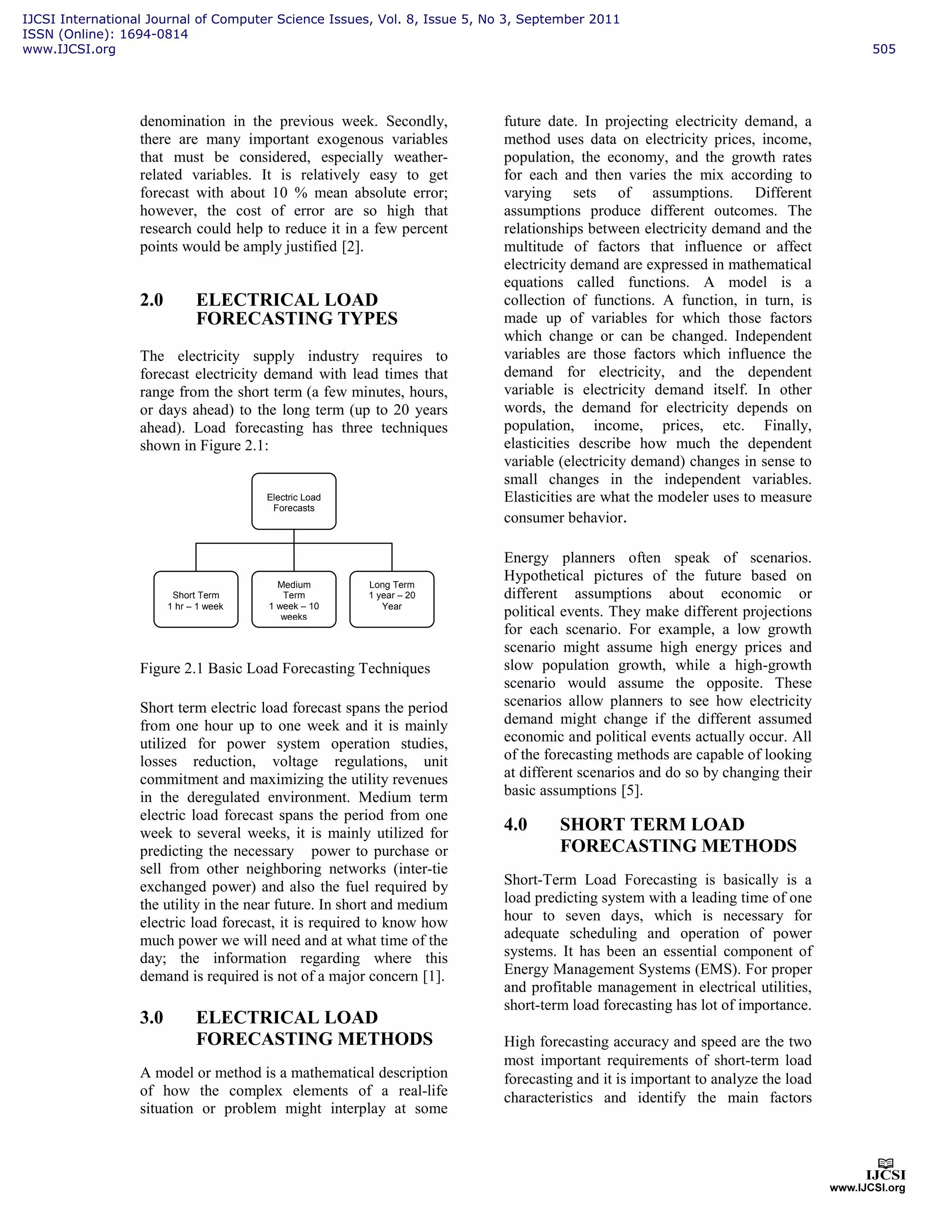 This document compares conventional and modern techniques for electrical load forecasting based on artificial intelligence and expert systems. It summarizes the key differences between short-term, medium-term, and long-term load forecasting and describes some common methods used, including regression analysis, time series analysis, artificial neural networks, expert systems, and fuzzy logic. The document advocates that modern soft computing techniques provide more accurate load forecasts than traditional analytical methods by better representing the complex, nonlinear relationships between load and influencing factors.