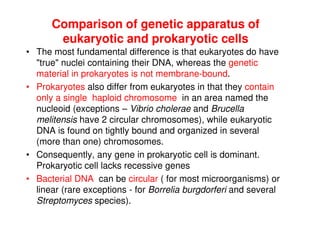 1. Prokaryotes lack a membrane-bound nucleus and have their DNA located in the nucleoid. They typically have a single circular chromosome while eukaryotes have multiple linear chromosomes.