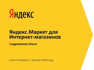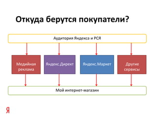 Документ описывает Яндекс.Маркет как платформу, соединяющую интернет-магазины и покупателей, предлагая удобные системы выбора товаров и сравнения цен. Указывается на рост аудитории и количество магазинов, а также на важные условия для регистрации интернет-магазина на платформе. Также рассматриваются возможности для маркетинга и рекламы, включая геотаргетинг и популяризацию товаров через отзывы и рейтинг.