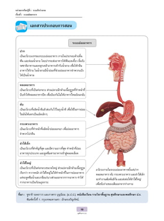 ระบบในร่างกาย เรื่องที่ 1 ระบบย่อยอาหาร ใบงานที่ 1.1 ระบบย่อยอาหาร คาชี้แจง ให้นักเรียนเขียนอธิบายการทางานของอวัยวะในภาพที่กาหนดให้ถูกต้อง 1. 2. 3. 4. 5. 6.