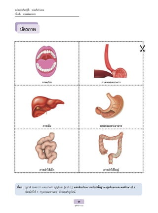 ระบบในร่างกาย เรื่องที่ 1 ระบบย่อยอาหาร ภาพปาก ภาพหลอดอาหาร ภาพตับ ภาพกระเพาะอาหาร ภาพลาไส้เล็ก ภาพลาไส้ใหญ่ บัตรภาพ ที่มา : ชูชาติ รอดถาวร และภาสกร บุญนิยม. [ม.ป.ป.]. หนังสือเรียน รายวิชาพื้นฐาน สุขศึกษาและพลศึกษา ป.5. พิมพ์ครั้งที่ 7. กรุงเทพมหานคร : อักษรเจริญทัศน์.