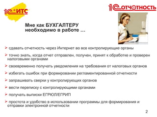 Документ описывает функциональность сервиса 1С-отчетность, который позволяет компаниям подавать электронные отчеты в контролирующие органы, избегать ошибок и получать уведомления о статусах отчетности. Он также акцентирует внимание на важности минимизации затрат на сервис и упрощении процесса работы для бухгалтеров и руководителей. Существуют тарифные планы и возможности для групп пользователей, что делает сервис доступным и удобным для разных организаций.