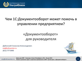 Документ описывает семинар по внедрению ERP-системы, проходивший 18 мая 2016 года в Санкт-Петербурге, с акцентом на автоматизацию документооборота. Программное обеспечение '1С:Документооборот 8' предложено для повышения управляемости, эффективности и информационной безопасности в компании. Семинар включает обсуждение возможностей и преимуществ системы, а также шаги по её внедрению и обучению сотрудников.
