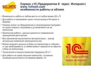 Облачный сервис «1с:предприятие 8 через интернет» предоставляет возможность работы в любом месте и в любое время, безопасное хранение данных и автоматические обновления. Он облегчает работу бухгалтеров и других сотрудников, позволяя эффективно управлять бизнесом через интернет. Пользователи могут воспользоваться бесплатным тестовым доступом, а также получить техническую и консультационную поддержку круглосуточно.