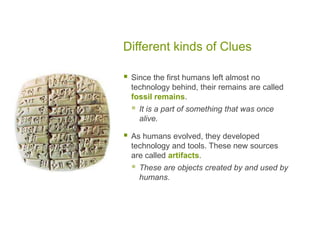 This document discusses different types of historical sources that can be used to understand the past. It defines fossils and artifacts as sources that provide clues about early humans since they left little technology behind. Primary sources are accounts created by witnesses, while secondary sources are created later by non-witnesses. Photographs can provide visual historical information but must be properly contextualized to avoid misinterpretation. It profiles several war photographers like Robert Capa who documented major conflicts to convey the human experience and violence of war.