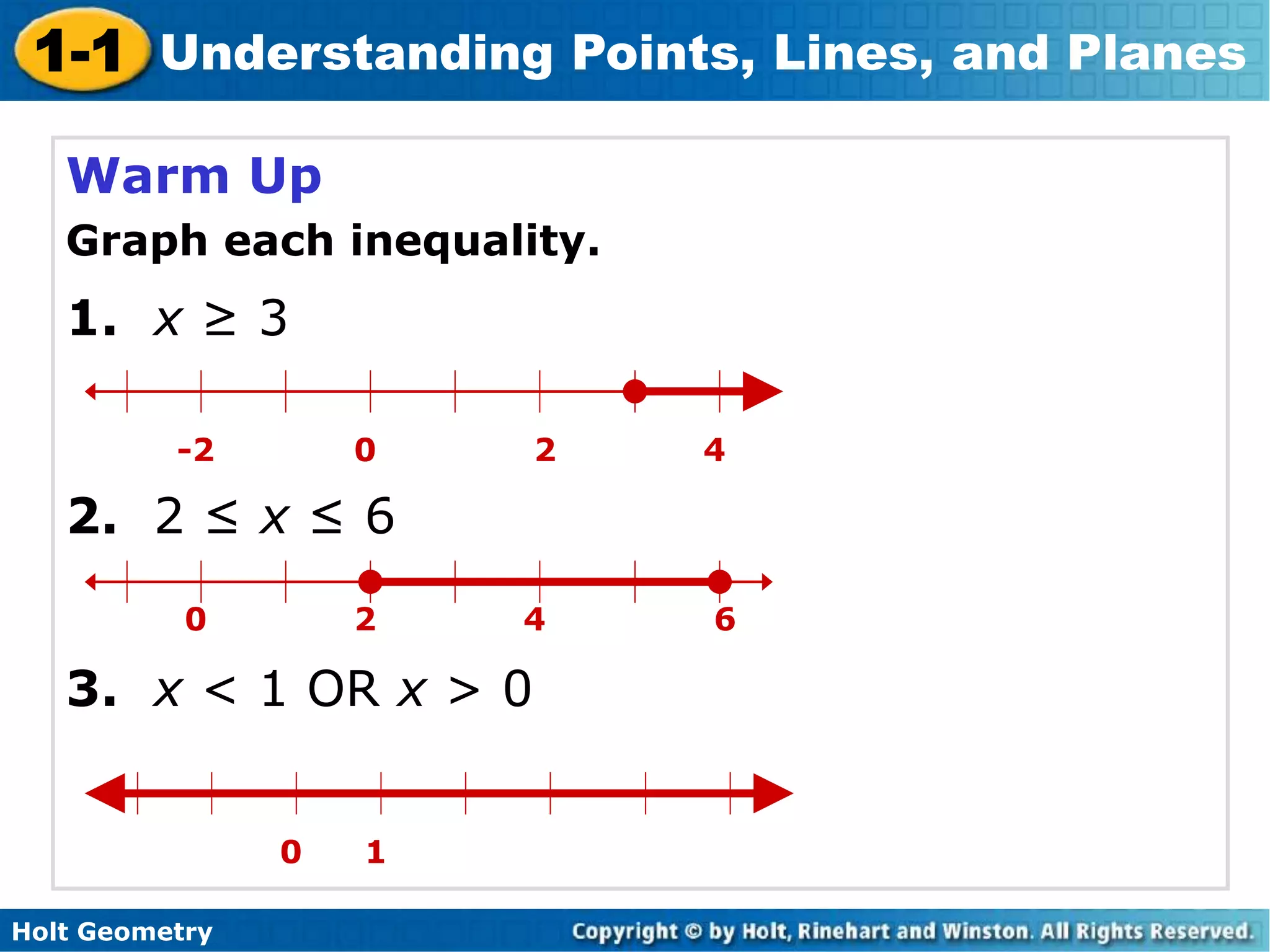 This document is from a Holt Geometry textbook and covers key concepts about points, lines, and planes. It defines points, lines, and planes as undefined terms that are building blocks of geometry. It discusses properties such as collinear points on a line, coplanar points on a plane, and intersections between lines and planes. Examples demonstrate naming and drawing points, lines, segments, rays, and planes as well as representing intersections between geometric figures.