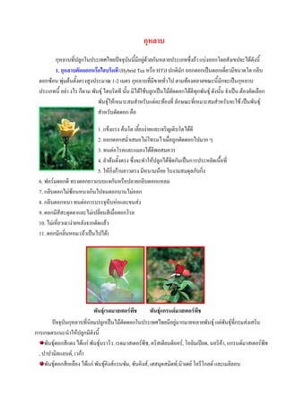 กุหลาบที่ปลูกในประเทศไทยปจจุบันนี้มอยูดวยกันหลายประเภทซึ่งถา แบงออกโดยสังเขปจะไดดังนี้ ี 1. กุหลาบตัดดอกหรือไฮบริดที (Hybrid Tea หรือ HT)J ปกติมัก ออกดอกเปนดอกเดี่ยวมีขนาดโต กลีบ ดอกซอน พุมตนตั้งตรงสูงประมาณ 1-2 เมตร กุหลาบทีมีขายทั่วไป ตามทองตลาดขณะนี้มักจะเปนกุหลาบ ่ ประเภทนี้ อยา งไร ก็ตาม พันธุ ไฮบริดที นั้น มิไดใชบลูกเปนไมตดดอกไดดทกพันธุ ดังนั้น จําเปน ตองคัดเลือก ั ี ุ พันธุใหเหมาะสมสําหรับแตละทองที่ ลักษณะที่เหมาะสมสําหรับจะใช เปนพันธุ สําหรับตัดดอก คือ 1. แข็งแรง ตนโต เลี้ยงงายและเจริญเติบโตไดดี 2. ออกดอกสม่ําเสมอไมโทรมไวเมื่อถูกตัดดอกไปมาก ๆ 3. ทนตอโรคและแมลงไดดพอสมควรี 4. ลําตนตั้งตรง ซึ่งจะทําใหปลูกไดชิดกันเปนการประหยัดเนื้อที่ 5. ใหกิ่งกานยาวตรง มีหนามนอย ใบงามสมดุลกับกิ่ง 6. ฟอรมดอกดี ทรงดอกยาวแบบแจกันหรือปลายกลีบดอกแหลม 7. กลีบดอกไมซอนหนาเกินไปจนดอกบานไมออก 8. กลีบดอกหนา ทนตอการบรรจุหีบหอและขนสง 9. ดอกมีสสะดุดตาและไมเปลี่ยนสีเมื่อดอกโรย ี 10. ไมเหี่ยวเฉางายหลังจากตัดแลว 11. ดอกมีกลินหอม (ถาเปนไปได) ่ พันธุเรดมาสเตอรพีช พันธุแกรนดมาสเตอรพีช ปจจุบันกุหลาบที่นิยมปลูกเปนไมตัดดอกในประเทศไทยมีอยูมากมายหลายพันธุ แตพันธุที่กรมสงเสริม การเกษตรแนะนําใหปลูกมีดังนี้ พันธุดอกสีแดง ไดแก พันธุบราโว. เรดมาสเตอรพีช, คริสเตียนดิออร, โอลิมเปยด, นอริคา, แกรนดมาสเตอรพีช , ปาปามิลแลนด, เวกา พันธุดอกสีเหลือง ไดแก พันธุคงสแรนซัม, ซันคิงส, เฮสมุดสมิดท,นิวเดย โอรีโกลด และเมลิลอน ิ