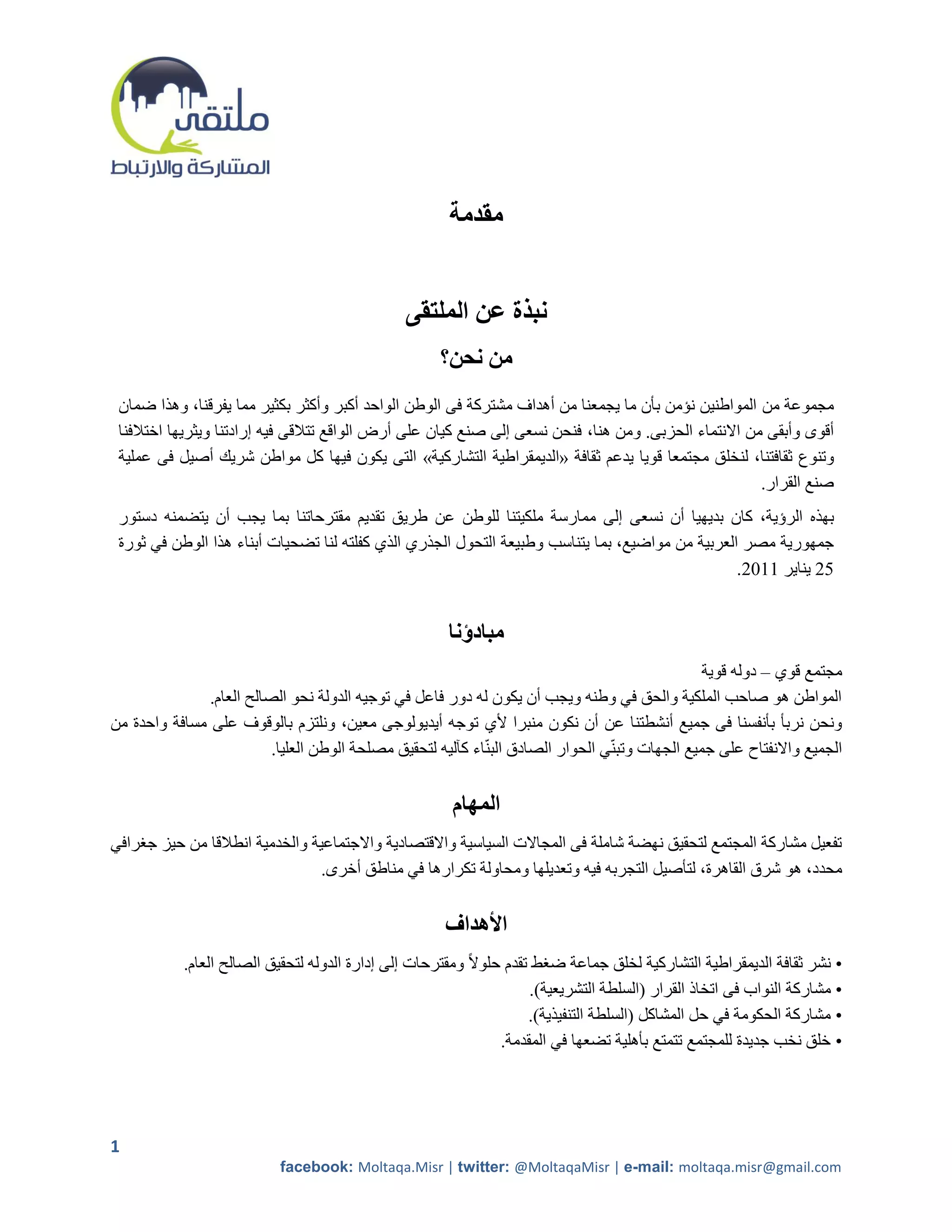 تهدف الوثيقة إلى تعزيز ثقافة الديمقراطية التشاركية في مصر من خلال مشاركة المواطنين في صناعة القرار وتشجيع مقترحات دستورية جديدة تواكب التحولات التي شهدتها البلاد بعد ثورة 25 يناير. تسعى المجموعة إلى بناء مجتمع قوي يستطيع توجيه الدولة نحو الصالح العام، من خلال تفعيل مشاركة المجتمع في المجالات السياسية والاقتصادية والاجتماعية. تم اقتراح مجموعة من المواضيع الدستورية المهمة التي تتعلق بالحقوق الأساسية والواجبات العامة، بالإضافة إلى تنظيم مواضيع الحكم المحلي وتوزيع الصلاحيات.
