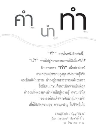เราเข้าใจว่าการรักตัวเอง การทำให้ใจเป็นสุข คือ การดูหนังฟังเพลง การช็อปปิ้ง การเที่ยว แต่จริงๆ แล้ว...ไม่ใช่ คำสอนของพระพุทธเจ้า 84,000 พระธรรมขันธ์ ก็อยู่ตรงนี้ จิตที่สงบ จิตที่ว่างจากการยึดติด กับอะไรทุกอย่าง ก็เป็นวิมุตติ คือ แนวคำสอน ของพระพุทธเจ้าที่เราค้นหากัน จงมีใจที่แน่วแน่ ตังมัน แล้วเราจะเข้าใจได้อย่างลึกซึง ไมีมโอนเอียง ้ ่ ้ ี เอนเอียงไปกับกิเลสที่มากระทบในใจเรา ความสามัคคีก็จะเกิดขึ้นในหมู่คณะเล็กๆ จนไปถึงบ้านเมืองก็ไม่ขัดแย้งกัน เทศน์ที่ศูนย์พัฒนาม่วงน้อยปูนซีเมนต์ไทยท่าหลวง จังหวัดสระบุรี วันพฤหัสบดีที่ 9 ตุลาคม พ.ศ. 2551 ค ำ น ำ ท ำ