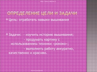 Документ описывает проект ученицы 9 класса, посвященный вышиванию в технике рококо, с акцентом на изучение истории и создание картины. В процессе работы были собраны материалы, разработан эскиз и выполнены шаги по вышиванию контуров и материков. В итоге, автор выражает удовлетворение от выполнения задания и отмечает, что работа хорошо вписывается в интерьер комнаты.