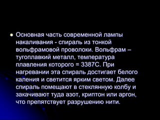 Документ описывает конструкцию и работу ламп накаливания и электрических нагревательных приборов. Основной частью лампы является вольфрамовая спираль, помещенная в газовую колбу, а электрические зоны применяются для обогрева и различных промышленных процессов. Описаны также устройства нагревательных элементов и приборов, таких как электрические утюги и плитки.
