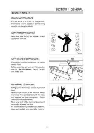 This document provides safety guidelines for operating and servicing excavators. It lists numerous hazards and precautions to take, including: wearing protective equipment; following safe procedures; preventing fires; avoiding moving parts; handling fluids safely; and more. The document emphasizes preparing for emergencies, protecting oneself from various risks, and properly maintaining and parking the excavator.