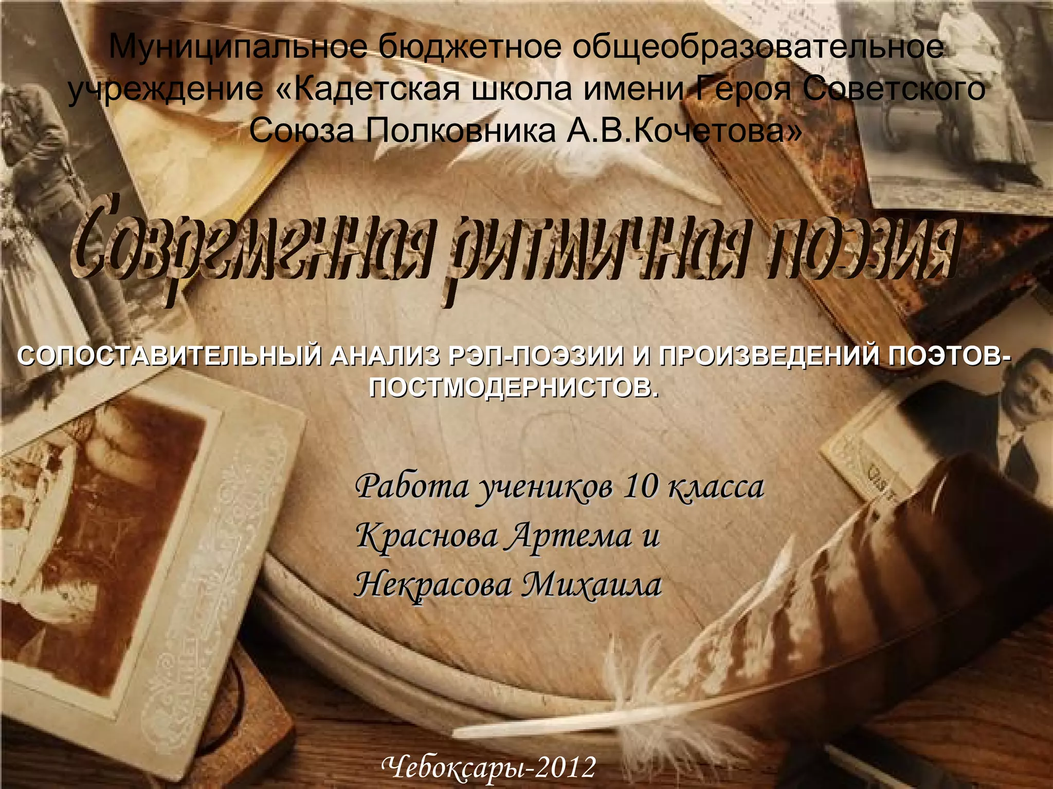 В работе проводится сопоставительный анализ рэп-поэзии и произведений постмодернистов, акцентируется на важности текста в современном молодежном искусстве. Цель исследования — доказать, что рэп-поэзия является частью современной поэтической культуры, установив связи с традициями классической поэзии. Данная работа расширяет знания о литературе и подчеркивает уникальность рэпа как симбиоза музыки и поэзии.