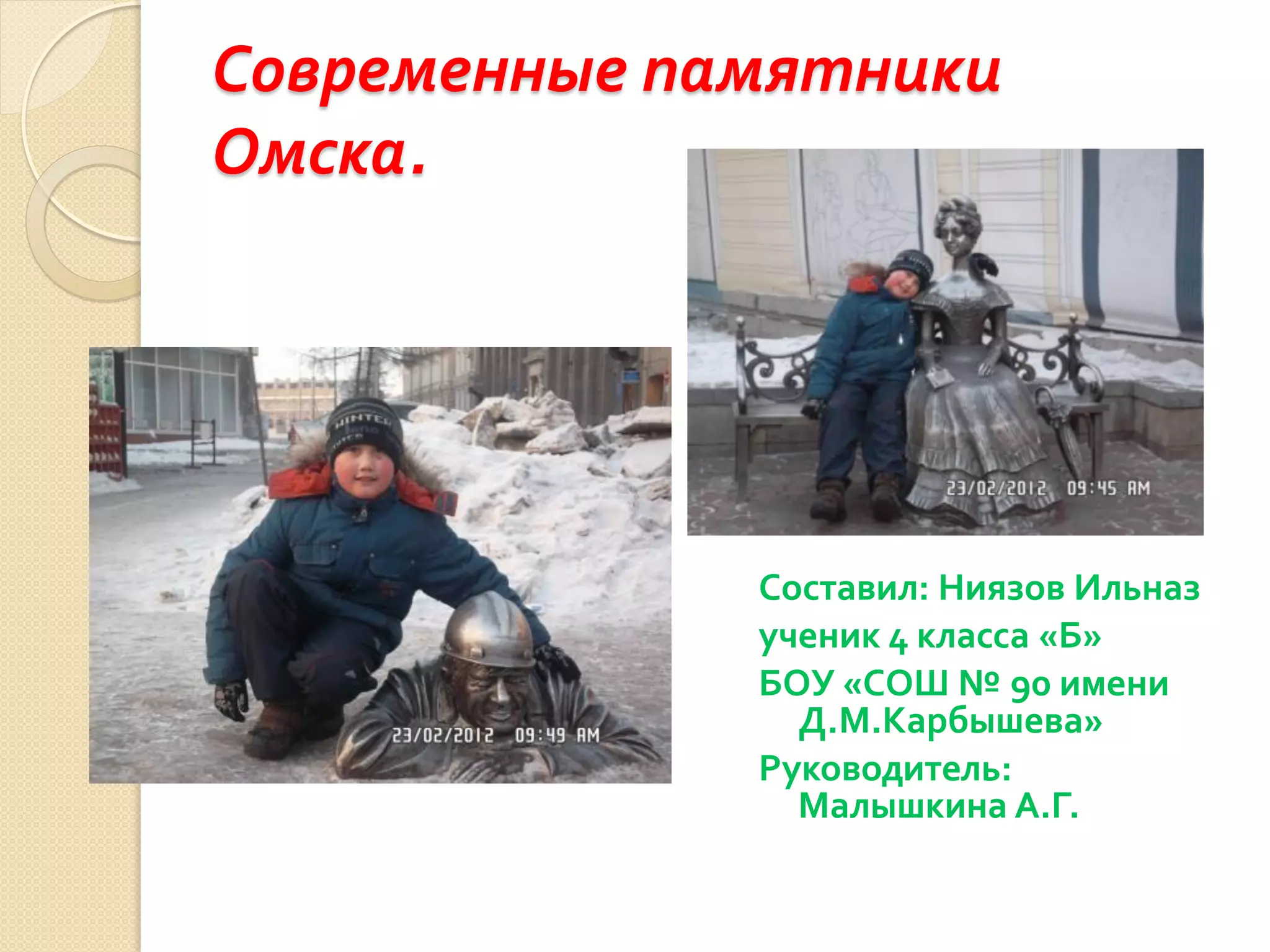 Документ представляет собой исследование памятников Омска, установленных после 2000 года, выполненное учеником 4 класса. Он охватывает различные виды скульптурных памятников, их исторические аспекты и примеры, а также включает опрос одноклассников о памятниках города. В заключении отмечается, что в Омске было установлено около 25 памятников с 2000 года.
