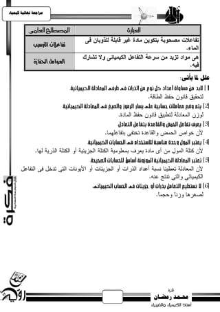 يتناول النص مجموعة من المفاهيم الكيميائية المتعلقة بالتفاعلات الكيميائية المختلفة، بما في ذلك الصيغ الأولية والجزيئية والمركبات. يتضمن أيضًا أمثلة على التفاعلات بين الأحماض والقواعد وعوامل التفاعل الأخرى. يشرح النص كيفية تصنيف المحاليل الكيميائية والقوانين المتعلقة بها.