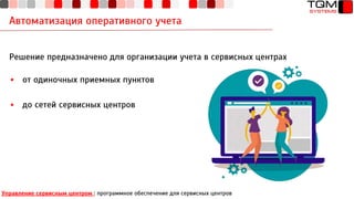 Документ описывает функциональные возможности программного обеспечения 1С:Предприятие 8 для управления сервисными центрами, включая учет и планирование ремонтных работ, взаимодействие с клиентами и сторонними сервисами. Он охватывает аспекты автоматизации оперативного учета и анализ деятельности сервисного центра с целью повышения эффективности. Программное обеспечение предоставляет инструменты для учета выездных и стационарных ремонтов, а также для управления подменным фондом и оформлением продаж.