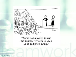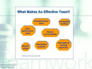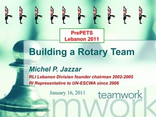This document discusses building effective Rotary teams. It provides acronyms to define team and system, and outlines Tuckman's five stages of team development: forming, storming, norming, performing, and adjourning. Key factors for team success include having a clear strategy, roles, open communication, rapid response, and effective leadership. Building consensus and avoiding challenges like personal agendas and conflict are also discussed.