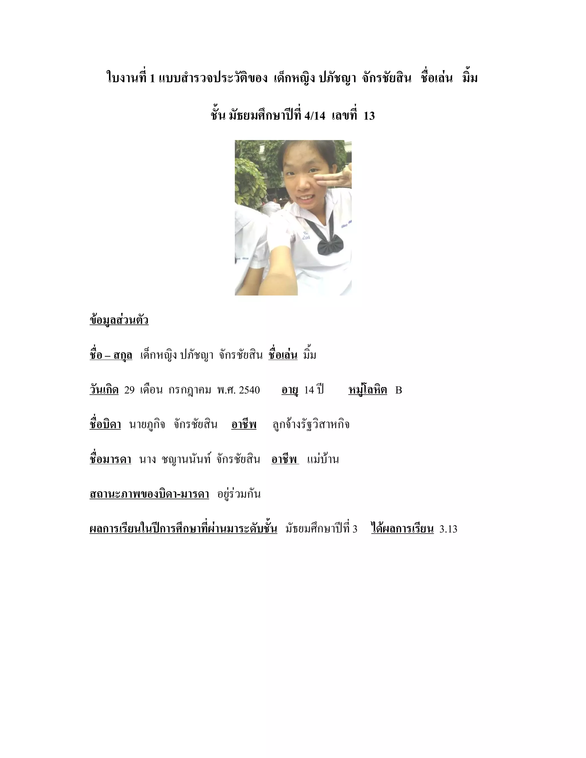 เด็กหญิง ปภัชญา จักรชัยสิน ชื่อเลน มิ้ม ชั้น มัธยมศึกษาปที่ 4/14 เลขที่ 13 ขอมูลสวนตัว ชื่อ – สกุล เด็กหญิง ปภัชญา จักรชัยสิน ชื่อเลน มิม ้ วันเกิด 29 เดือน กรกฎาคม พ.ศ. 2540 อายุ 14 ป หมูโลหิต B ชื่อบิดา นายภูกจ จักรชัยสิน อาชีพ ลูกจางรัฐวิสาหกิจ ิ ชื่อมารดา นาง ชญานนันท จักรชัยสิน อาชีพ แมบาน สถานะภาพของบิดา-มารดา อยูรวมกัน ผลการเรียนในปการศึกษาที่ผานมาระดับชั้น มัธยมศึกษาปที่ 3 ไดผลการเรียน 3.13