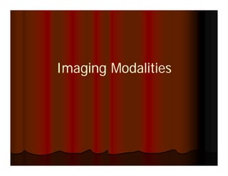 This document provides an introduction to various medical imaging modalities including X-ray, CT, mammography, MRI, PET, SPECT, and ultrasound. It discusses the principles, techniques, and indications for each modality. Key terms are defined. Images demonstrate examples of each type of imaging. The objectives are to recognize imaging study types, discuss how images are produced, list common indications, and describe imaging precaution considerations.